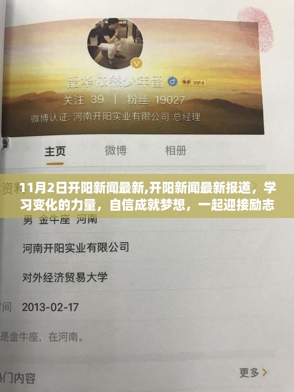 在这个充满变化和机遇的时代,让我们一起迎接励志的十一月,让我们从开阳新闻的最新报道中汲取力量,坚定信念、努力学习、勇敢变化,相信我们自己、相信我们的潜力、相信我们的梦想,让我们一起努力、一起进步、一起成就属于我们的梦想,让我们记住这句话:学习变化的力量,自信成就梦想,在11月的阳光下,一起启程、向着梦想前进!在开阳的这片土地上,共同书写属于我们的励志故事!让我们用这份力量感染身边的每一个人,共同创造一个更加美好的未来!