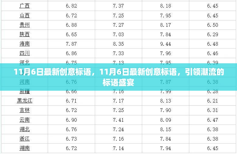 随着时代的变迁,创意标语在营销和宣传中扮演着越来越重要的角色,本文将为您呈现11月6日最新创意标语,这些标语汇聚智慧与创意,为您的品牌注入活力,引领潮流。