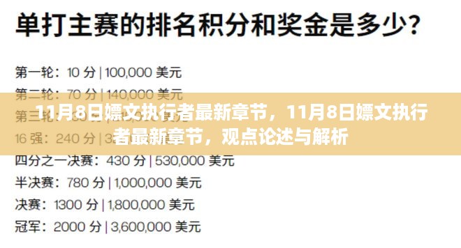 随着网络文学的发展,越来越多的作品以惊人的速度更新,11月8日嫖文执行者最新章节”引起了广大读者的关注,这部作品所呈现的情节发展、人物塑造以及背后所蕴含的社会议题,都成为了人们热议的焦点,本文将围绕这部作品的最新章节,从不同观点进行分析和论述,以探讨其内在价值和社会意义。